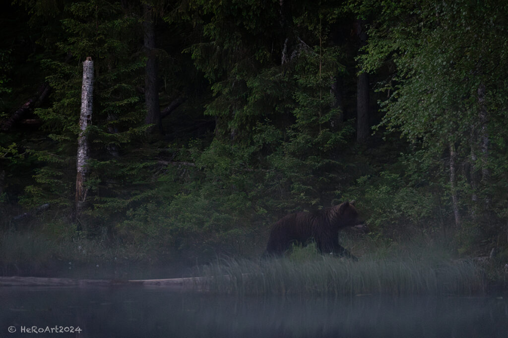 Meni vajaa tunti, kun metsän siimeksestä kömpi paikalle isompi varjo. Hieman jo paremmassa valossa, vaikka vieläkin hämärää. Sehän oli karhu. Ihka oikea nalle. Se oli paljon maltillisempi liikkeissään ja tutkisteli rantaa pidempään. Ensimmäiset karhukuvat oli saatu tallennettua. Aikansa ruokailtuaan ja tutkittuaan karhu lähti syvemmälle metsään ja katosi näkyvistä. Mutta toisin kuin ahma, palasi vielä pari kertaa uudelleen paikalle. Viimeisin näyttäytyminen oli kolmen aikoihin, jolloin aamuvalot antoivat jo ihan eri tavalla valotusmahdollisuuksia kamerallekin.